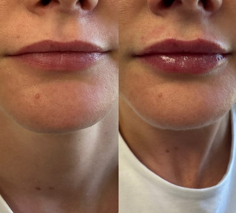 The treatment involves carefully injecting hyaluronic acid-based dermal filler into the lips to achieve natural, subtle enhancement.
